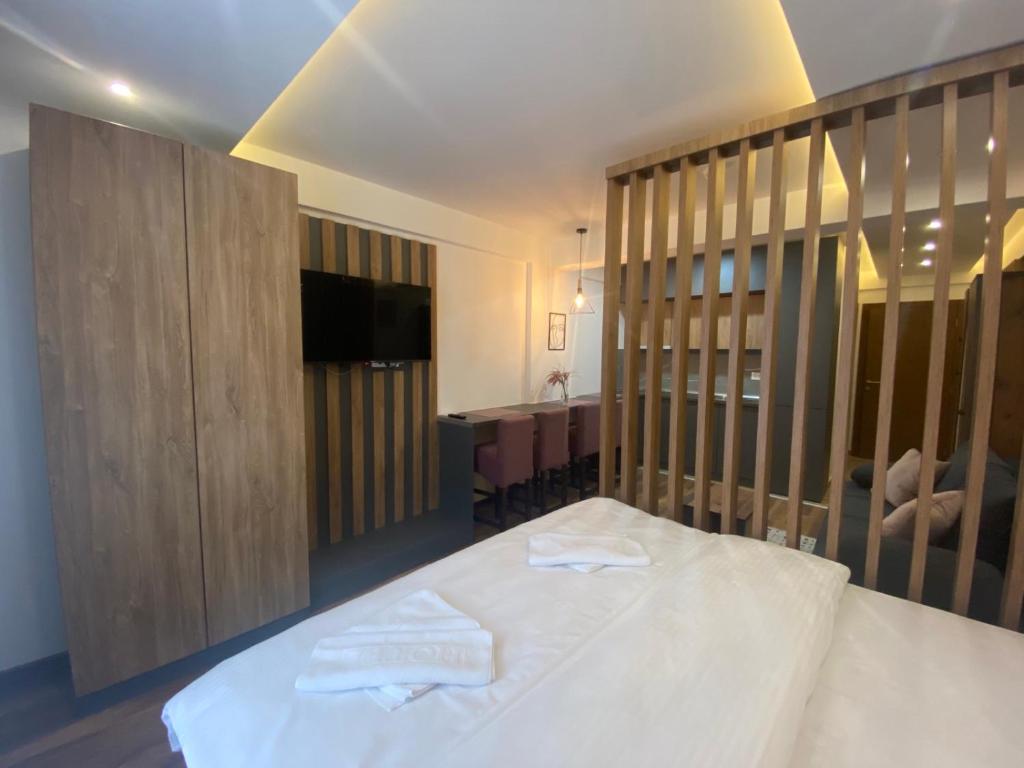 Guests will have a special experience as this apartment offers a pool with a view. This apartment is consisted of of 1 living room, 1 separate bedroom and 1 bathroom with a shower and slippers. The well-equipped kitchen features a stovetop, a refrigerator and kitchenware. The apartment has a seating area, a dining area, a wardrobe as well as a balcony with mountain views. The unit offers 2 beds.